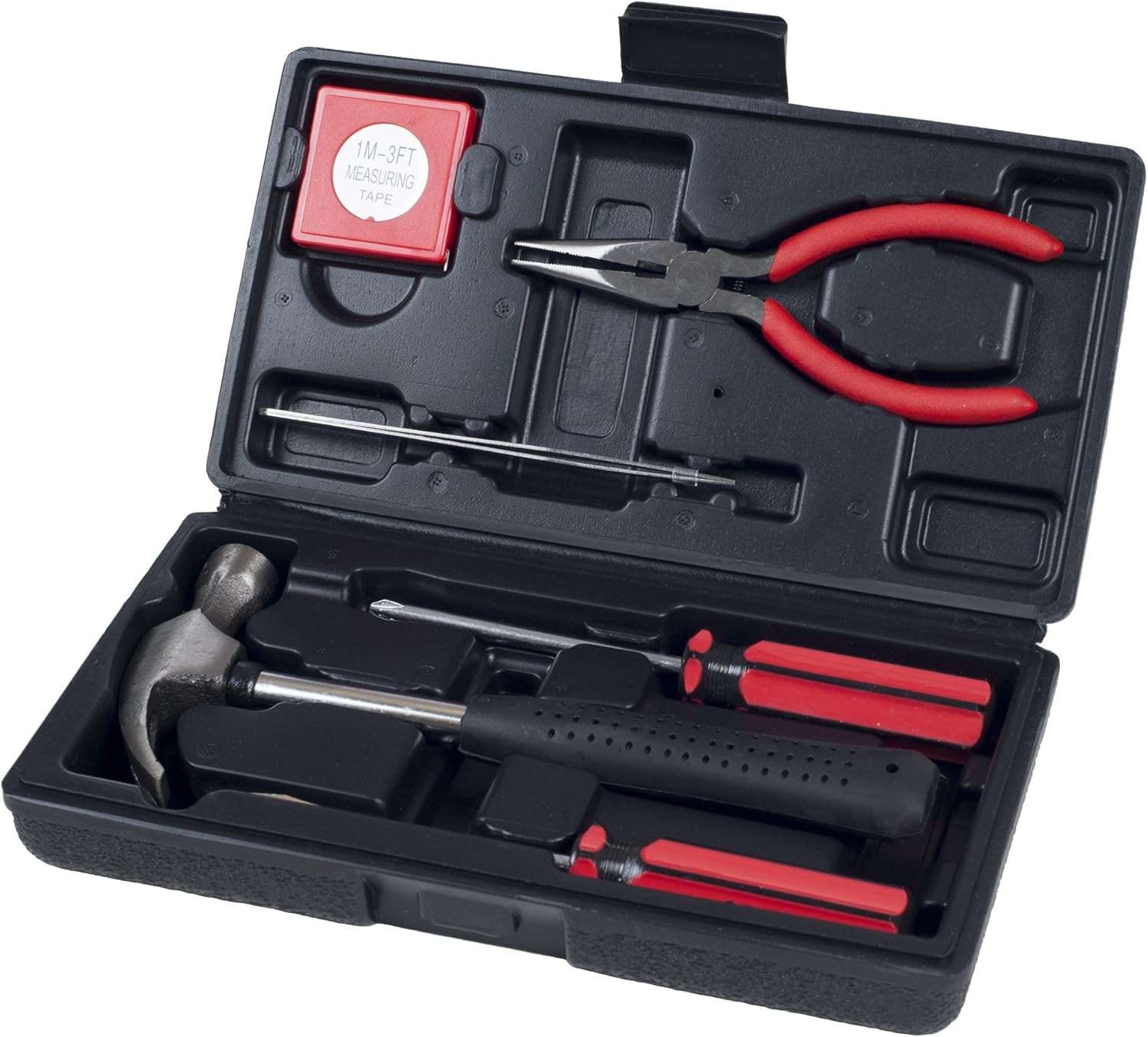 75-piece set with basic hand tools for general household repairs.Includes screwdrivers, pliers, hammer, tape measure, and more.