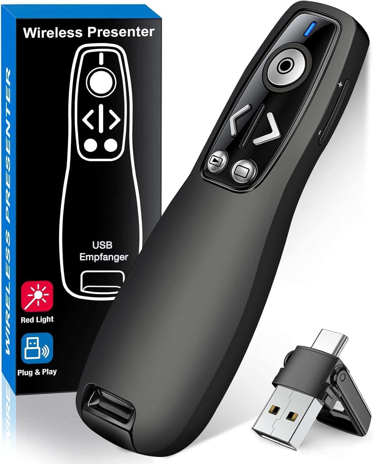 USB receiver with plug-and-play setup.Red laser pointer for enhanced visibility.